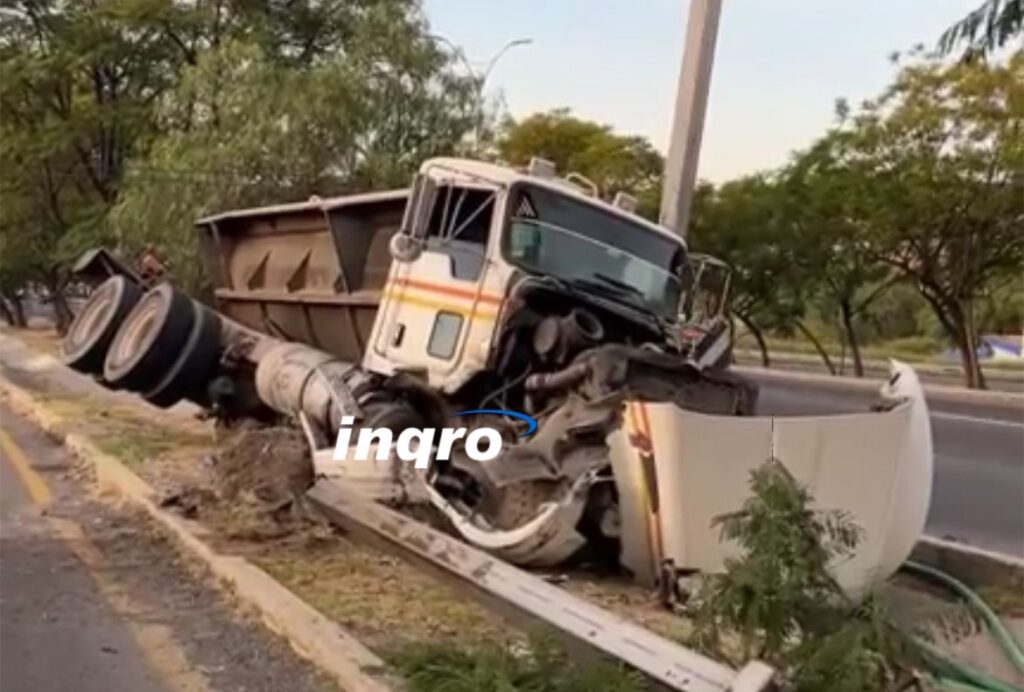 El accidente ocurrió la tarde de este sábado, luego de que el operador perdiera el control de la unidad pesada y a consecuencia se impactara contra un señalamiento, el cual derribó.