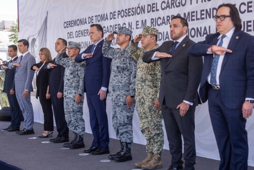 El titular del Poder Ejecutivo estatal, Mauricio Kuri González, estuvo presente en la toma de posesión al cargo y protesta de bandera del general Ricardo Melendrez Cervantes, quien asumió el puesto como coordinador estatal de la Guardia Nacional en Querétaro.